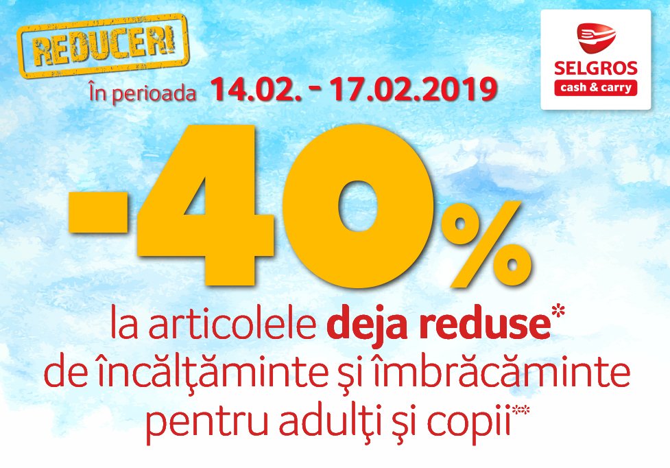 La Selgros ai reducere de 40% la articolele cu preţul deja redus de încălțăminte și îmbrăcăminte pentru adulți și copii, în perioada 14.02 -17.02.2019. Caută etichetele cu reducere!