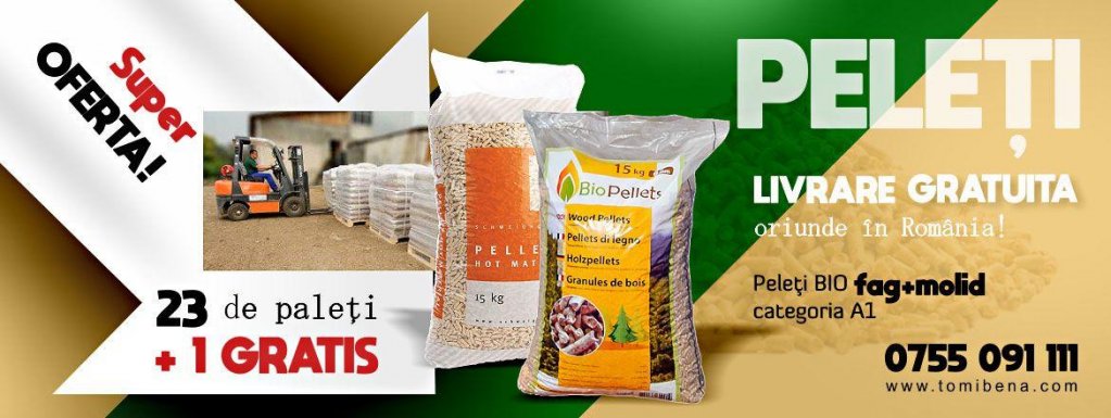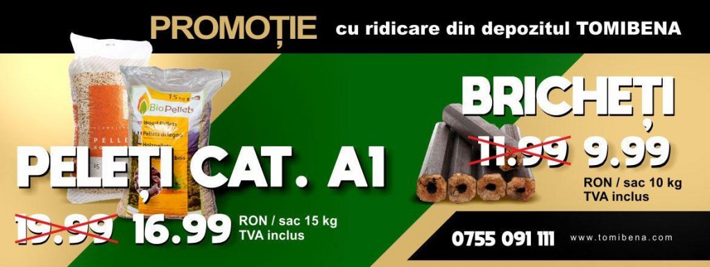 De la Tomibena se pot procura saci cu peleți din fag și molid la cele mai bune prețuri, iar livrarea este gratuită. Se pot folosi pentru șemineuri, sobe, centrale. Peleții se comercializează la saci de 15 kg. Cantitea minimă care se poate comanda este de un palet, adică de 70 de saci de peleți. Prețul unui sac este de 19.99 lei. Super Ofertă: 16.99 lei/ sac de 15 kg în cazul ridicării de către client a peleților din depozitul Tomibena